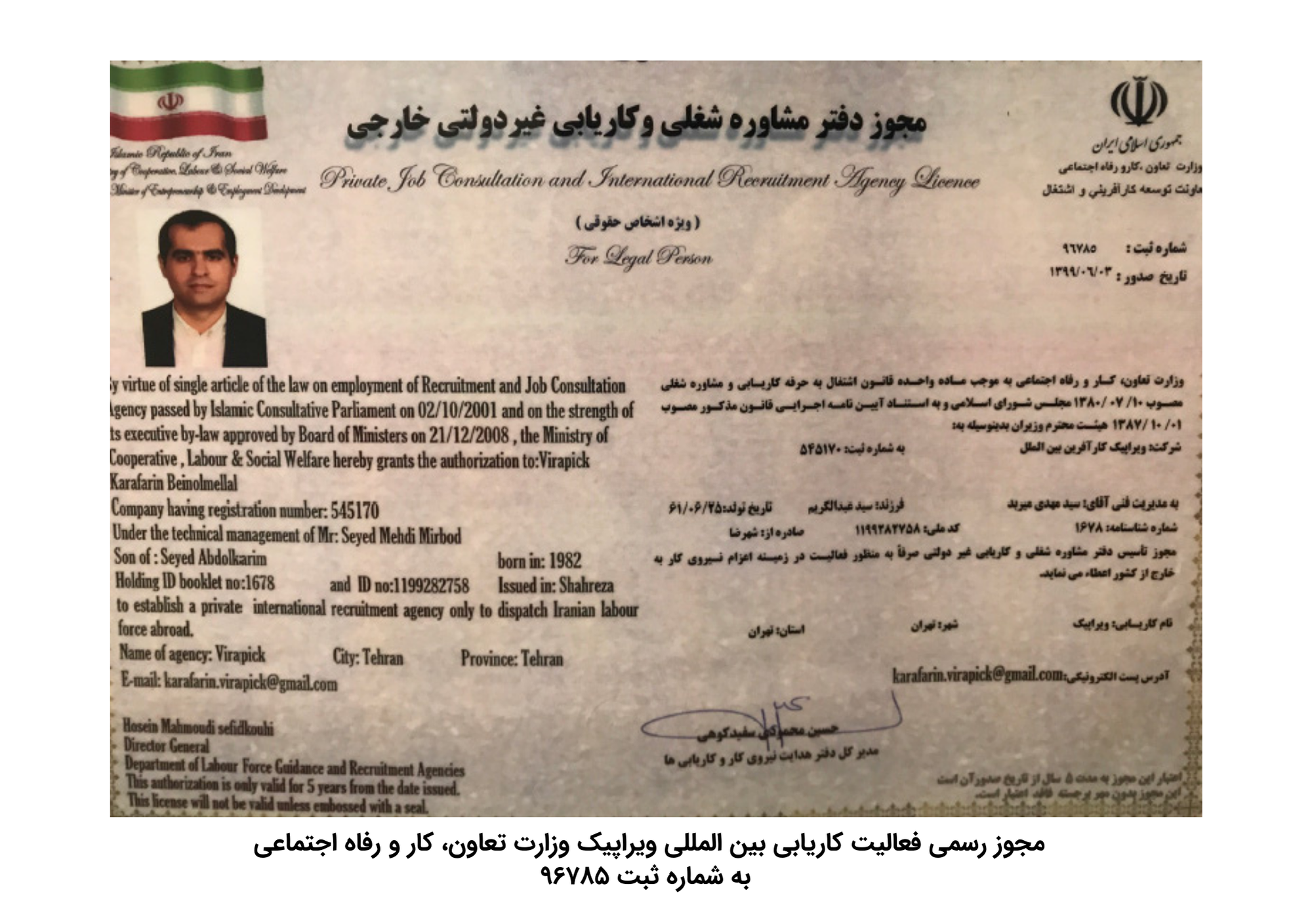 مجوز رسمی فعالیت کاریابی بین المللی ویراپیک