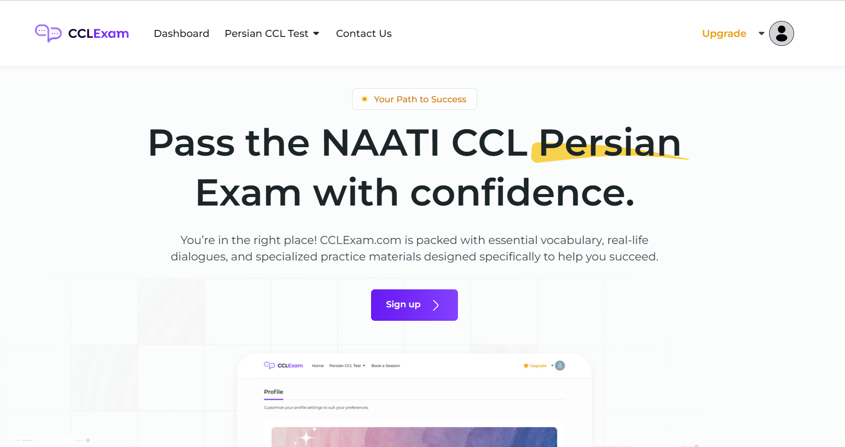پلتفرم CCLexam پلتفرمی اختصاصی برای تمرین و آمادگی آزمون ناتی (NAATI CCL) که بهصورت شبیهسازیشده و تعاملی طراحی شده است. تمرینها با وسواس زیاد اعتبارسنجی شده و فضای تمرین بسیار نزدیک به آزمون واقعی ناتی است.